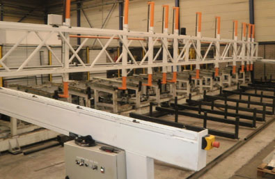 Ontwikkeling: Vanwege ruimtegebrek aan de afvoerzijde van de laser is er gekozen een vierkant-tralie bovenop een looprails te monteren. Hier doorheen zijn de tandbanen gemonteerd die de lepels op een neer bewegen. Het portaal loopt door tot boven de buffertafel. Hierdoor kan de portaal automatisch in een nul-stand gebracht worden, waardoor de operator op een veilige en ergonomisch verantwoorde manier, productcontrole kan uitvoeren. Het aantal laadposities van bundels gereed product is verhoogd van 2 naar 8.